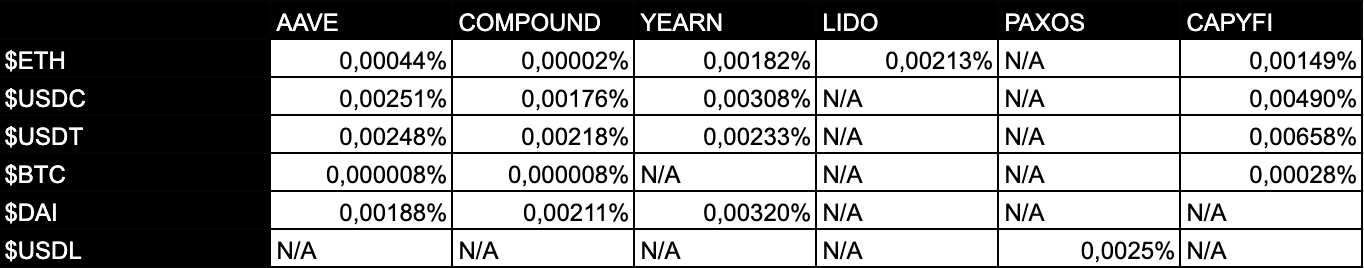 El Usuario reconoce y acepta que al ordenar la realización de Operaciones estará aceptando y obligándose según los términos y condiciones y/o las reglas de funcionamiento del Protocolo elegido para cada Operación. Los Protocolos que la Empresa pone a disposición del Usuario, y sus correspondiente términos y condiciones y/o reglas de funcionamiento, son: AaVe (https://app.aave.com/markets/), Compound (https://compound.finance/), Yearn (https://yearn.finance/vaults), LIDO (https://lido.fi/terms-of-use), PAXOS (https://liftdollar.com/terms-and-conditions) y Capyfi (https://capyfi.com). Esta enumeración no es taxativa y tanto los Protocolos como los sitios web asociados a estos Protocolos podrían variar.